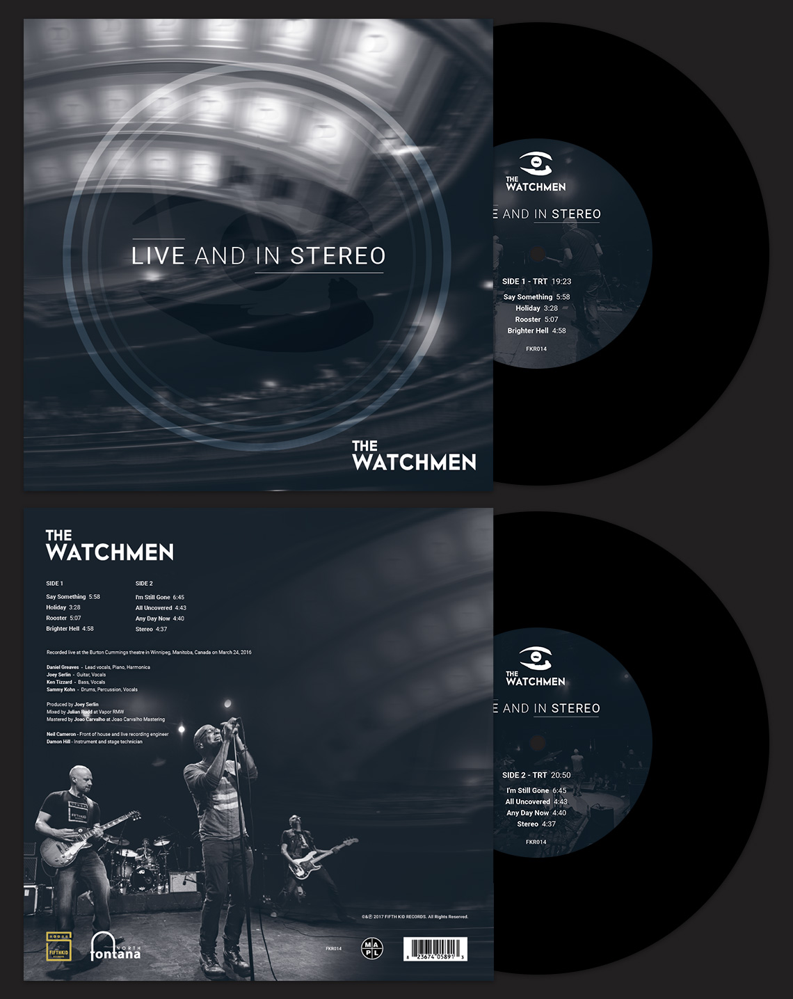 A vinyl record album cover and album stickers were created for a double sided release for the band, The Watchmen.